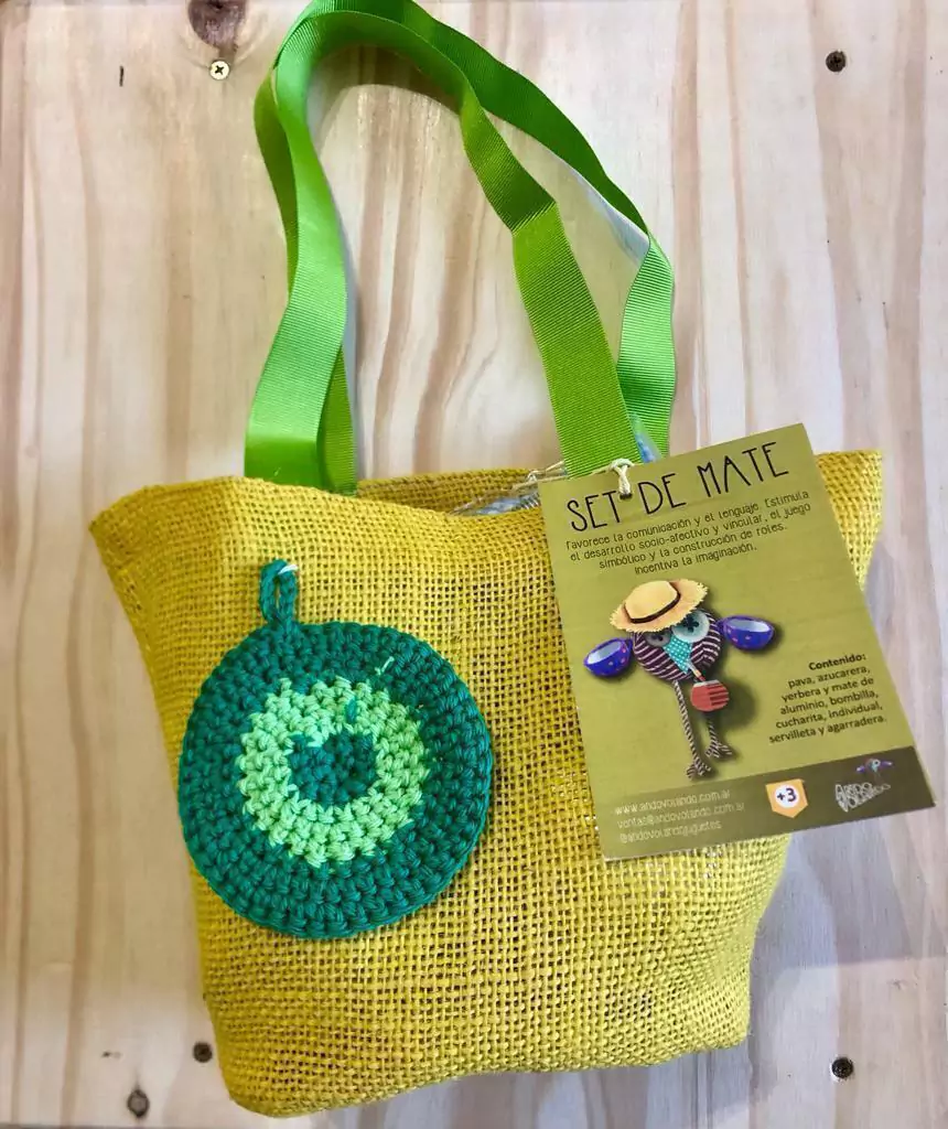 Contenido: Pava, mate, bombilla, yerbera y azucarera de aluminio, agarradera tejida a mano, mantel individual con servilleta y cucharita.